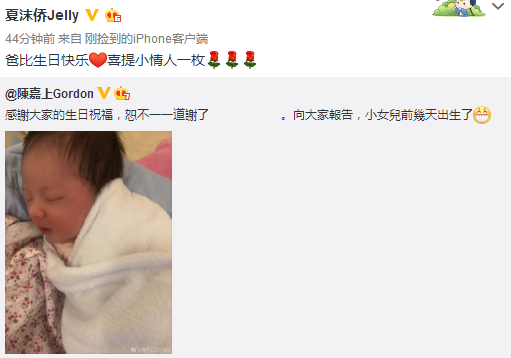 女儿的降临又适逢陈嘉上的60岁大寿,可谓是双喜临门啊!小他30岁的娇妻夏沫侨也在微博上甜喊“爸比”并送上生日祝福给老公,从夏沫侨的称呼可以看出,平日也肯定深得陈嘉上的宠爱了。
