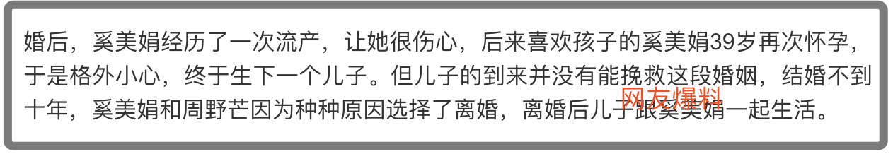 现实生活中的奚美娟也是一名伟大的母亲,早前有网络爆料称,奚美娟39岁高龄生下儿子,但却和同为演员的丈夫周野芒离婚,独自一人抚养儿子。