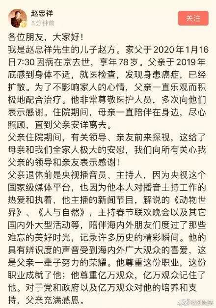 在今天早上,赵忠祥的儿子赵方证实自己的父亲赵忠祥今日因癌症在京去世,享年78岁,而赵忠祥的近照也随着家人的展示,让我们又一次看到了赵忠祥的昔日的模样,