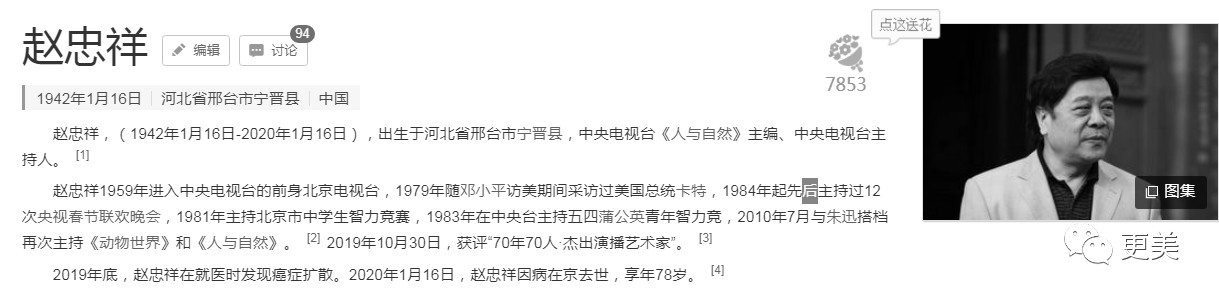百度百科上,赵忠祥老师介绍页面也已经变成了冷冰冰的黑白色。