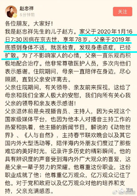 突发!赵忠祥的儿子赵方今早在社交媒体宣布赵忠祥老师于2020年1月16日7:30因患癌在北京某医院去世,享年78岁,告别了人生的舞台。