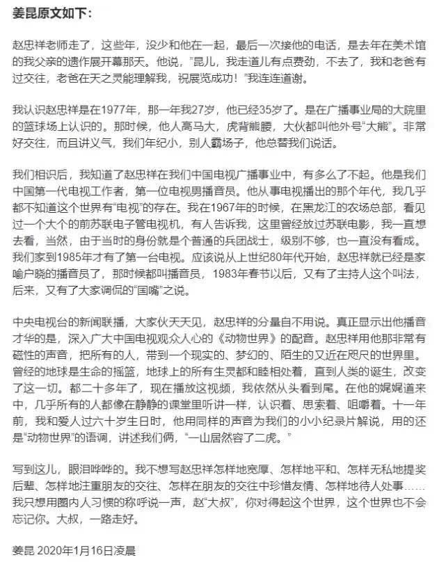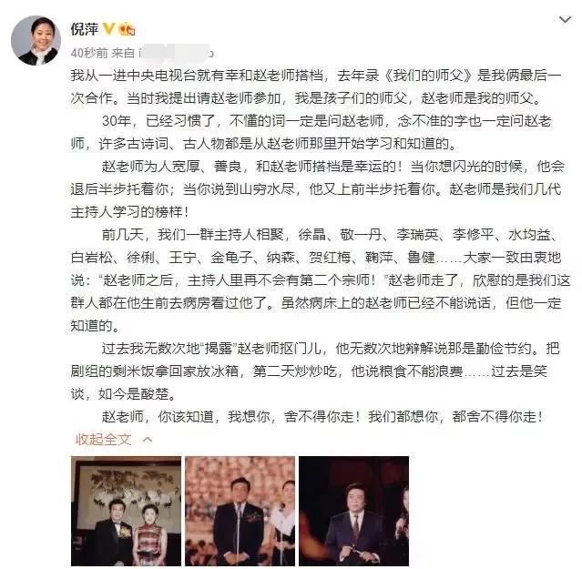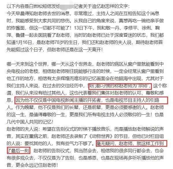 赵忠祥离世的消息传出后,许多与他合作过的主持人都悲痛不已,纷纷发文悼念。