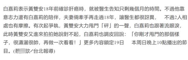 可见积极对抗病魔,所带来的结果要比选择性忽视好太多。在专访中,白嘉莉也大方分享了她与丈夫之间的生活趣事,虽然平时也会有小的争吵,但他们很快就会和好如初,不会把矛盾积攒。有次两人发生争执,黄双安大力甩门而去,力度太大,门发出了“砰”的一声,白嘉莉也感觉受到了委屈,眼泪跟着流了下来。不过这时黄双安也认识到了自己的不对,他连忙回去拍拍白嘉莉并道歉,白嘉莉也不再揪着对方的不是,反倒调侃道:“你刚才甩门的那个样子,很潇洒很帅,再做一次看看!”