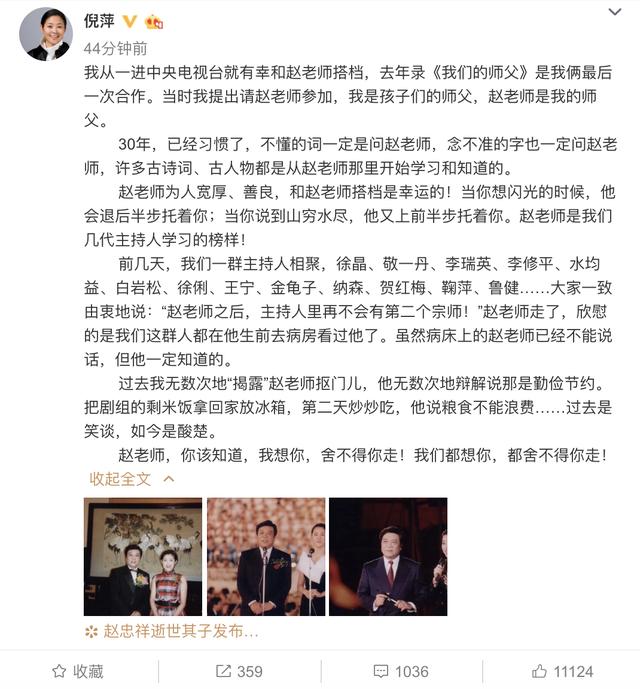 原标题:倪萍发长文追忆赵忠祥:舍不得你走,主持人里再不会有第二个