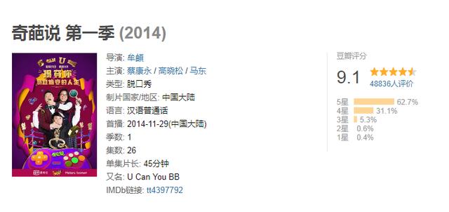 《奇葩说》从2014年开始做起,每一年都会推出新一季。除了第一季是永不会超越的封神之作9.1分,之后的五季也没跌出7.5分以外。虽然这两年观众渐渐有了希望节目能找回初心的意见,但是制作水平还是及格在线的。