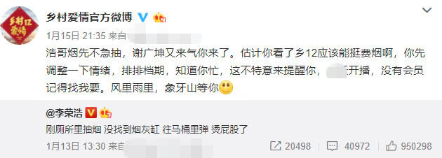 前段时间李荣浩发了条动态,随后“抽烟烫屁股”的话题就上了热搜榜,这明星实在没有偶像包袱甚至还有些“傻里傻气”也是圈了不少粉,乡爱的官微也就开始“蹭热度”了,转发李荣浩的微博调侃先别抽烟了,“谢广坤又来气你了”也是疯狂给自己加戏啊。