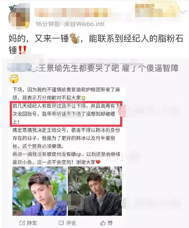 而之后迪丽热巴粉丝还放出黄景瑜粉丝对其经纪人的道歉,该粉丝称经纪人曾经批评过不让他下场,再有下次就收回账号。