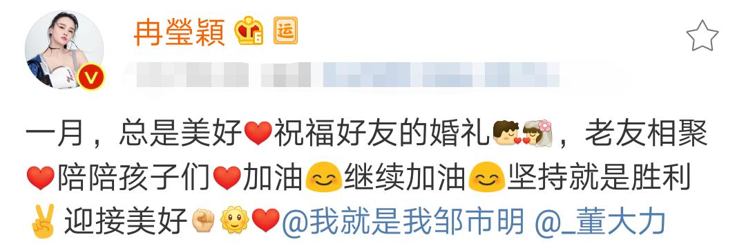 冉莹颖写到:“一月,总是美好,祝福好友的婚礼,老友相聚,陪陪孩子们。加油,继续加油,坚持就是胜利,迎接美好。”与此同时,她上传了多张参加婚礼的现场照片,有的是与邹市明摆出“比心”动作的合照,有的则是与两个儿子的同框,还有一张是露出自己雪白修长美腿的照片。