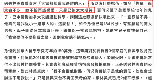 林美贞表示,现在自己最关心的就是儿子孙恒。今年已经18岁的孙恒不日便要前往加拿大攻读运动学科,对此她表示非常舍不得。林美贞自曝,儿子每年的留学费都要150万台币。这笔费用对于要负担三个家庭的孙兴来说不是一笔小数目,况且他由于劣迹斑斑的过往,如今发展十分有限,此前也常被曝出付不起赡养费的传闻。