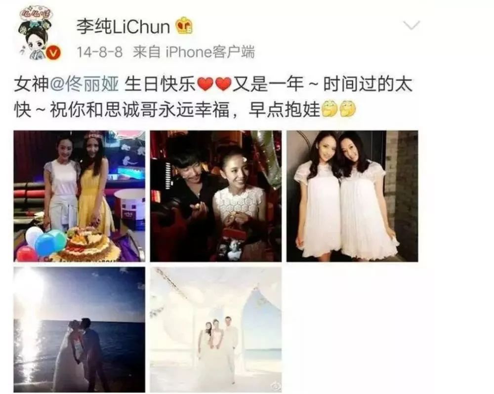 尴尬的是佟丽娅也没回应。很短时间之后,李纯也删掉了很多关于佟丽娅的微博,比如2016年佟丽娅生孩子她送的祝福,现在也找不到了。