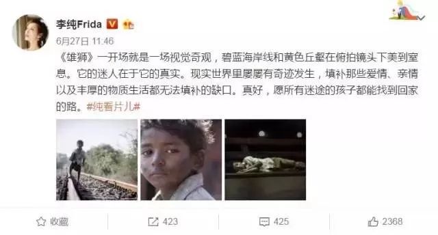 毕竟截止到今年,李纯也已经31岁了,即将32岁,肯定不属于小鲜花级别。可能她不像其它红到发紫的流量小花那样,每日都有着排不完的档期和资源。但蛮珍贵的是,她一直都有颗热爱电影和表演的心,就像她微博会点评小众文艺佳作《雄狮》。