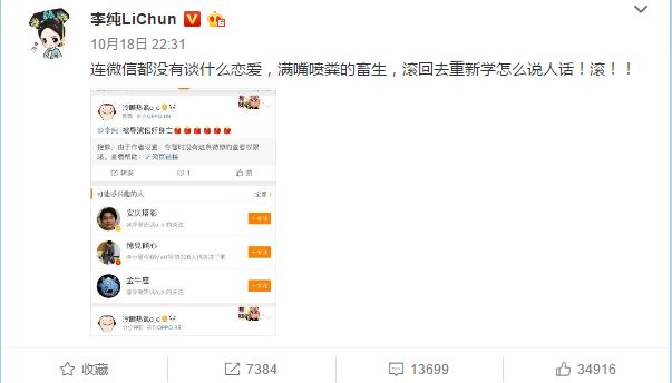 但是仍然有不少情绪激动的粉丝在微博和其他社交平台上对李纯进行人身攻击,因此李纯才在18号晚上发文怒怼网友。她发微博愤怒称:“连微信都没有谈什么恋爱,满嘴喷粪的畜生,滚回去重新学怎么说人话!滚!!”