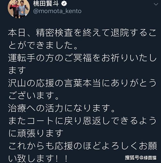 就在今天桃田贤斗也通过个人社交媒体发声,他表示经过仔细的检查,自己已经可以出院了,谢谢大家的关心支持,争取尽早复出。同时桃田贤斗还为去世的司机祈福。
