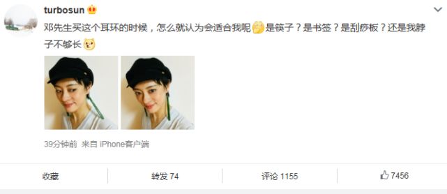 11月1日,孙俪更新了自己的社交平台,晒出了自己戴耳环的照片,并配文:邓先生买这个耳环的时候,怎么就认为会适合我呢,是筷子?是书签?是刮痧板?还是我脖子不够长,言语里轻松幽默,打趣自己老公邓超,没想到咱们超哥的品味受到了娘娘的质疑啊。