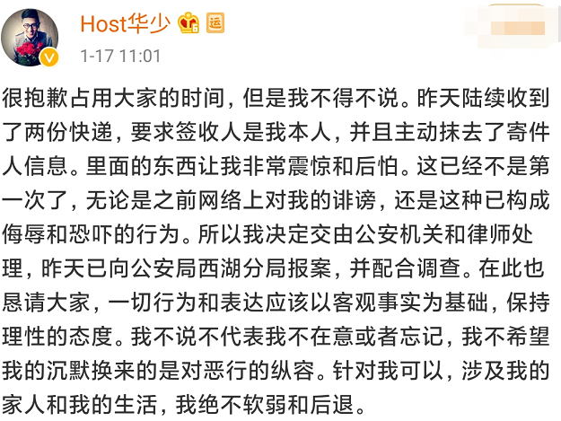 1月17日,知名主持人华少在社交平台发表动态,他声称自己本不想占用公共资源,但是这次他不得不为自己发声。华少之所以如此气愤,是因为他在1月16日连续收到两份匿名恐吓快递,对方要求他本人签收,发件人信息被涂抹,而里面的“礼物”让他震惊和后怕。