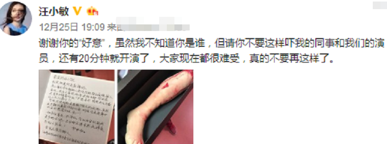 歌手汪小敏曾在演出前收到一份圣诞礼物,当时吓坏了团队中的人,里面放着一副假肢,汪小敏还是比较温柔的,没有去指责网友,而是劝告他们别做这样的事情。