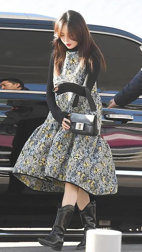 而前不久现身机场的泫雅,居然穿了一件碎花的“孕妇裙”,宽松的裙摆风一吹就现出小细腿来,泫雅这造型真是夸不动了,不知道这样的泫雅你还喜爱吗?孕妇裙本来因为是为特殊时期设计的服装,为了穿脱上的方便,裙子的版型会设计得特别的宽松。而娃娃裙大多数也是宽松的裙摆版型,所以就非常受可爱小女生喜欢,和腰线基本上是无缘的。像是泫雅在机场穿着的这一款裙子,就更加偏向于碎花娃娃裙了,本来裙子就没有腰身,再加上褶皱的裙摆部分就更加显得位置低了。虽然像是这种宽松版型的裙装,穿上身的舒适度是非常不错,但对于身材比较娇小的女生来说,只会显得更加的拖沓。因为对于身材娇小的女生来说,收腰并且高腰的设计绝对是很有必要的一点,日常穿搭中裤子都是高腰版型,更别提是这样一款连衣裙了呢!但是泫雅可不怕,还硬生生穿出来时尚感呢!