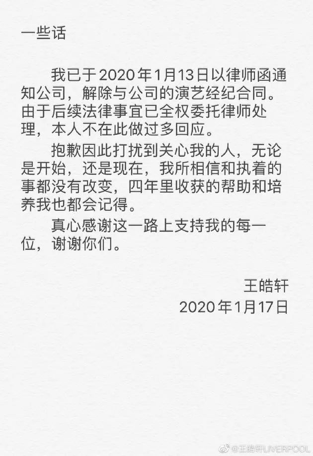 1月17日,王皓轩在微博发文,表示已发律师函通知公司解除合约,并对经纪公司四年的帮助与培养表示感谢。