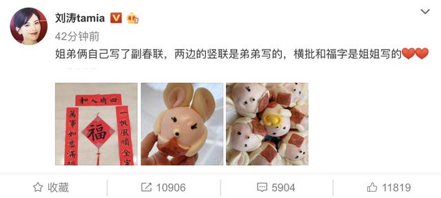 1月19日,刘涛在社交平台更新了动态,她配文道,姐弟俩自己写了副春联,两边的竖联是弟弟写的,横批和福字是姐姐写的。