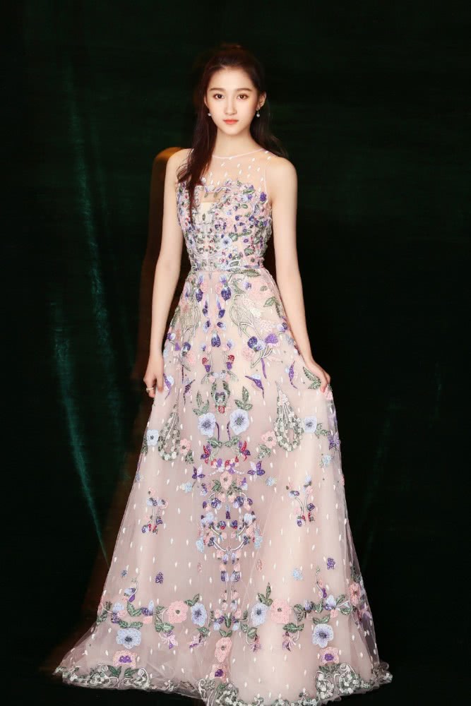 这张照片中关晓彤穿了一件粉色的刺绣花朵轻纱裙,显得非常甜美,一看就是那种清纯可人的甜美少女,除此之外这件裙子的款式设计也是显得非常大气优雅。