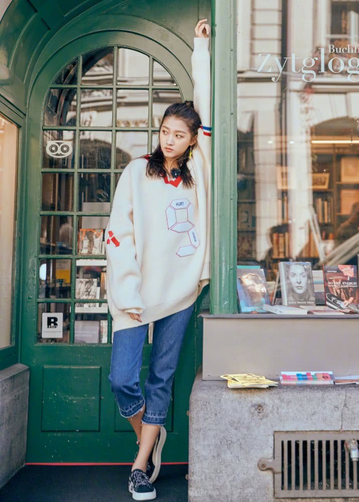 这张照片中关晓彤身穿一件白色的针织衫加上蓝色的牛仔裤,很日常的穿搭,呈现出满满的青春活力,感觉少女感十足。