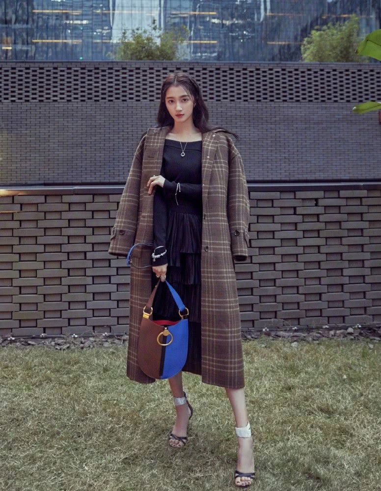 这张照片中关晓彤身穿一件黑色的蛋糕裙搭配上外面的格纹大衣,显得非常帅气,将整体的气场都提升了很多,展现出一种典雅复古的气质。