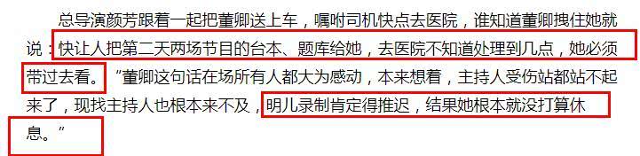 总导演也跟着去了医院,还嘱咐司机开快点。但是董卿却对导演说道:“快让人把第二天两场节目的台本、题库给她,去医院不知道处理到几点,她必须带过去看。”大家都以为要临时找主持人录制第二天的内容,可董卿却压根没想过要因为这点伤而休息。