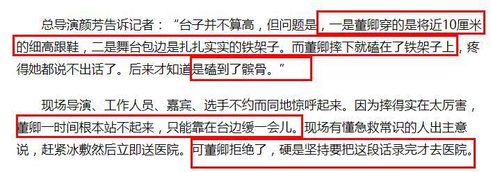 其实不管是不是春晚,董卿不管主持什么节目,她都要求自己做到最好。就比如,四年前她在录制节目《诗词大会》的时候,为了完善一个镜头,她要求重新录制一部分。当时她穿着10厘米的细高跟鞋,在她说完话的时候要转过身去看大屏幕,可就在那时转身的时候没站稳一下子就掉下了台。虽然台面只有半米高,但因为台下都是铁架子,董卿整个人都摔在了上面,非常严重。