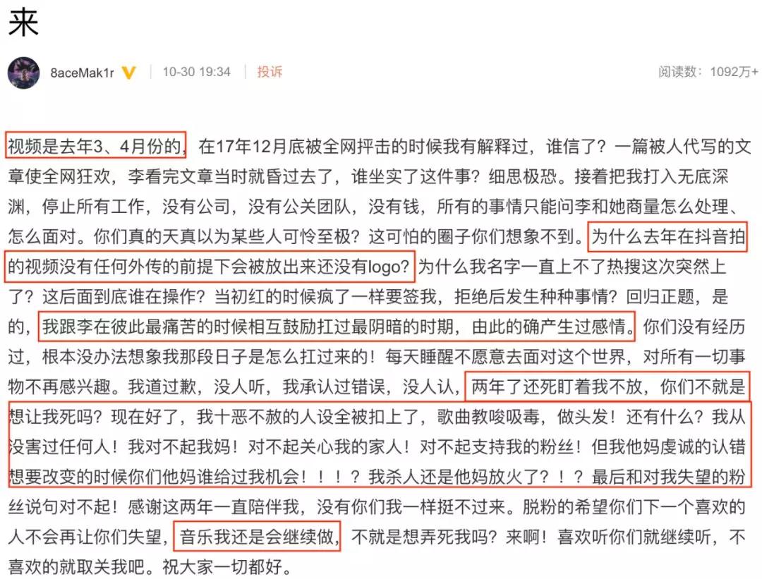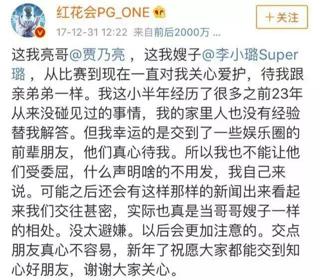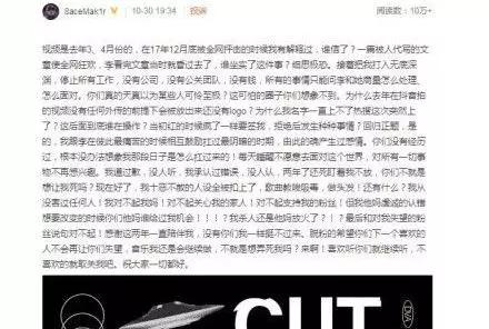 有意思的是,在这篇言辞激烈,甚至夹带着错别字与粗口的“自杀式回应”当中,他没有提及李小璐大名,通篇以“李”代替;也并不认为自己给原所属嘻哈组合“红花会”的兄弟们带来过麻烦,更未向李小璐的丈夫贾乃亮道歉。
