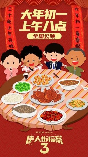 不仅如此,其他几部电影也发布了新海报。其中《唐人街探案3》依然没有提档,毕竟是信心十足,还称三十晚上年夜饭、大年初一看唐探,也是很有“针锋相对”的意思了。也就说,希望大家大年三十还是和家人团聚吃年夜饭吧。