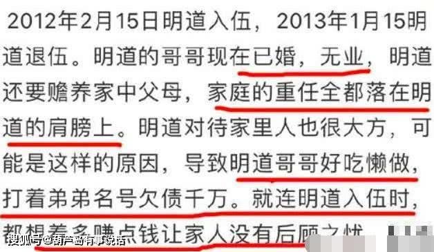 后来,明道出道成名后就担任起了养家的重任。不仅给爸爸妈妈买房,还包揽了哥哥结婚的所有费用。哥哥在明道有钱后就不务正业,一直都是无业状态。后来会和妻子一起卖卤肉,但在去年12月底夫妻俩就再也没有开过店。明道哥哥在2013年开始就赌钱欠债,明道为他还了不少。他哥哥还拿着明道的身份证去做抵押贷款,明道要工作养父母还要养哥哥和侄子,还要帮哥哥还债。