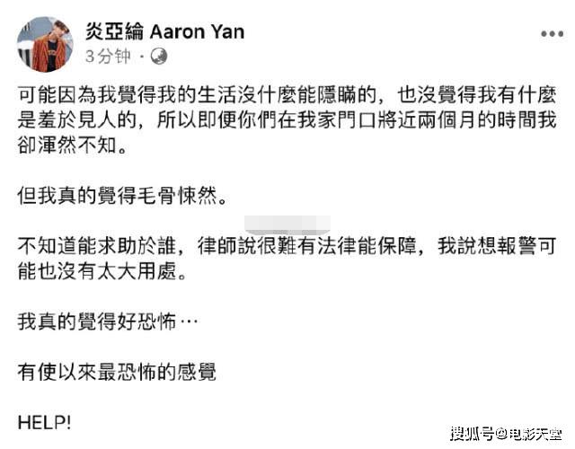 然而似乎是现在视频被曝出了之后炎亚纶也知晓的,于是觉得非常害怕,因为咨询过律师这样的行为并没有法律可以保障,所以他觉得自己身处险境,很恐怖,满腹的委屈和恐惧,并且打出了“help!”向大众求助,也是很难承受长达两个月的蹲守监视了。
