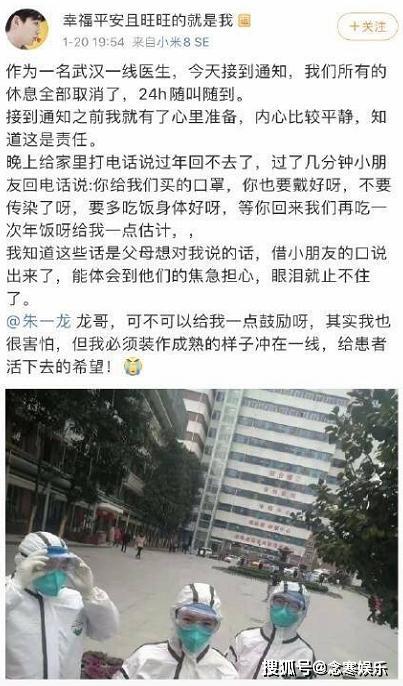其中,有一名网友通过微博自称是武汉一线医生,接到通知之后,院方取消所有人的休息,二十四小时必须随叫随到。从话语之间,可以看出她的无奈,也可以看出她的坚强,在灾情如此严重的情况之下,即便是天使也会感到害怕,这个时候她就寻求偶像朱一龙,能够给她一些鼓励不再害怕。
