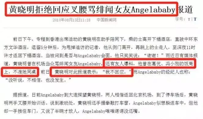被媒体拍到后黄晓明不仅对此不作回应还被曝出,当初黄晓明带杨颖来到内地时,因为要会见华谊公司的冯小刚等人,带着杨颖去的他甚至不让杨颖上桌吃饭。