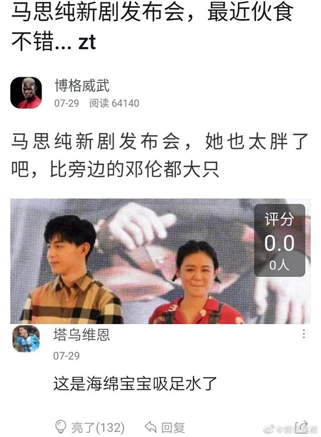马思纯和邓伦的新剧发布会,原标题的意思是马思纯胖了比旁边的邓伦都大只,有人接着来了句“这是海绵宝宝吸足水了”。