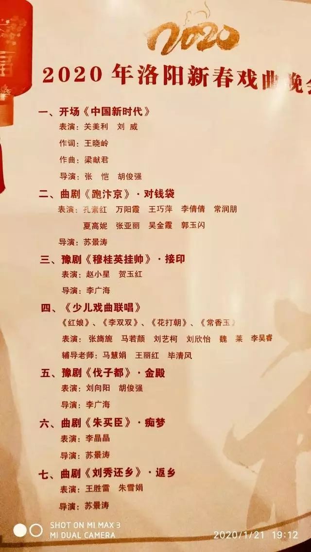 元月22日,农历腊月廿八,晚上,2020年洛阳新春戏曲晚会在洛阳市会议中心举办。整台晚会主题鲜明,气势恢宏,贴近群众,喜庆祥和;节目精彩纷呈,震撼人心。各位演职人员辛苦了!