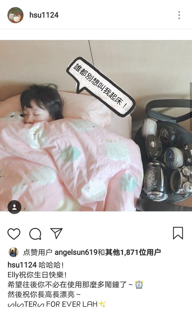 Lilly晒照后并幸灾乐祸地祝福道:哈哈哈!Elly祝你生日快乐!希望往后你不必再使用那么多闹钟了,然后祝你长高长漂亮!仔细一看,旁边还真的是有好多闹钟,其实这样反而会让拖延症变得越来越严重!
