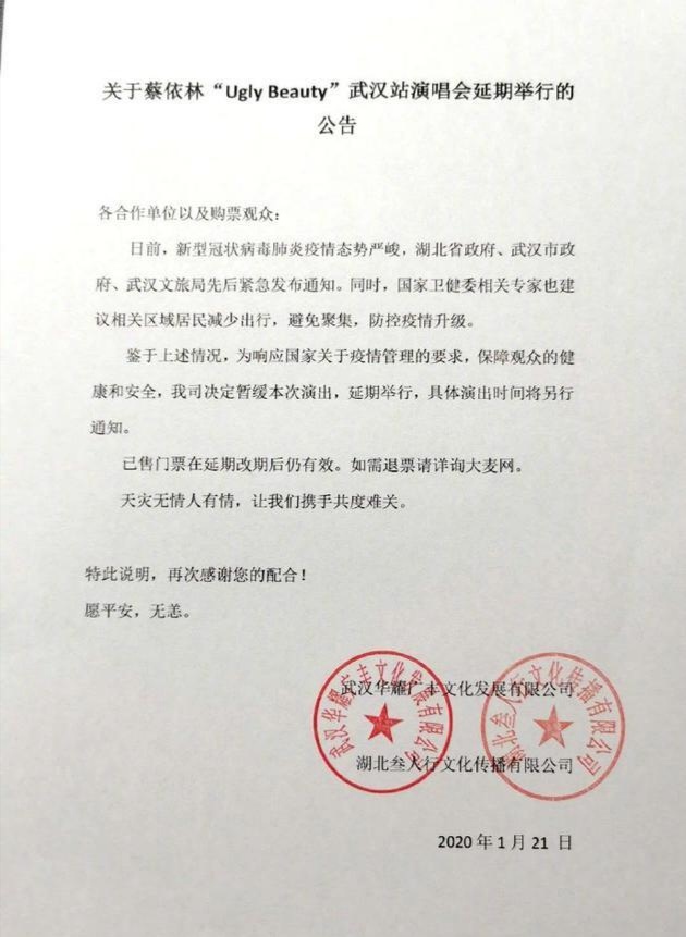 1月21日,华耀文化官博发出公告,宣布2020蔡依林演唱会武汉站将延期举行。据官博说,此次蔡依林武汉站演唱会原计划将于3月7日举办,但是由于最近新型冠状病毒引发的肺炎引起全国人民的关注和热议,主办方为保障观众的健康和安全,决定延期举办该次演唱会,并表示已售门票在延期改期后仍有效。