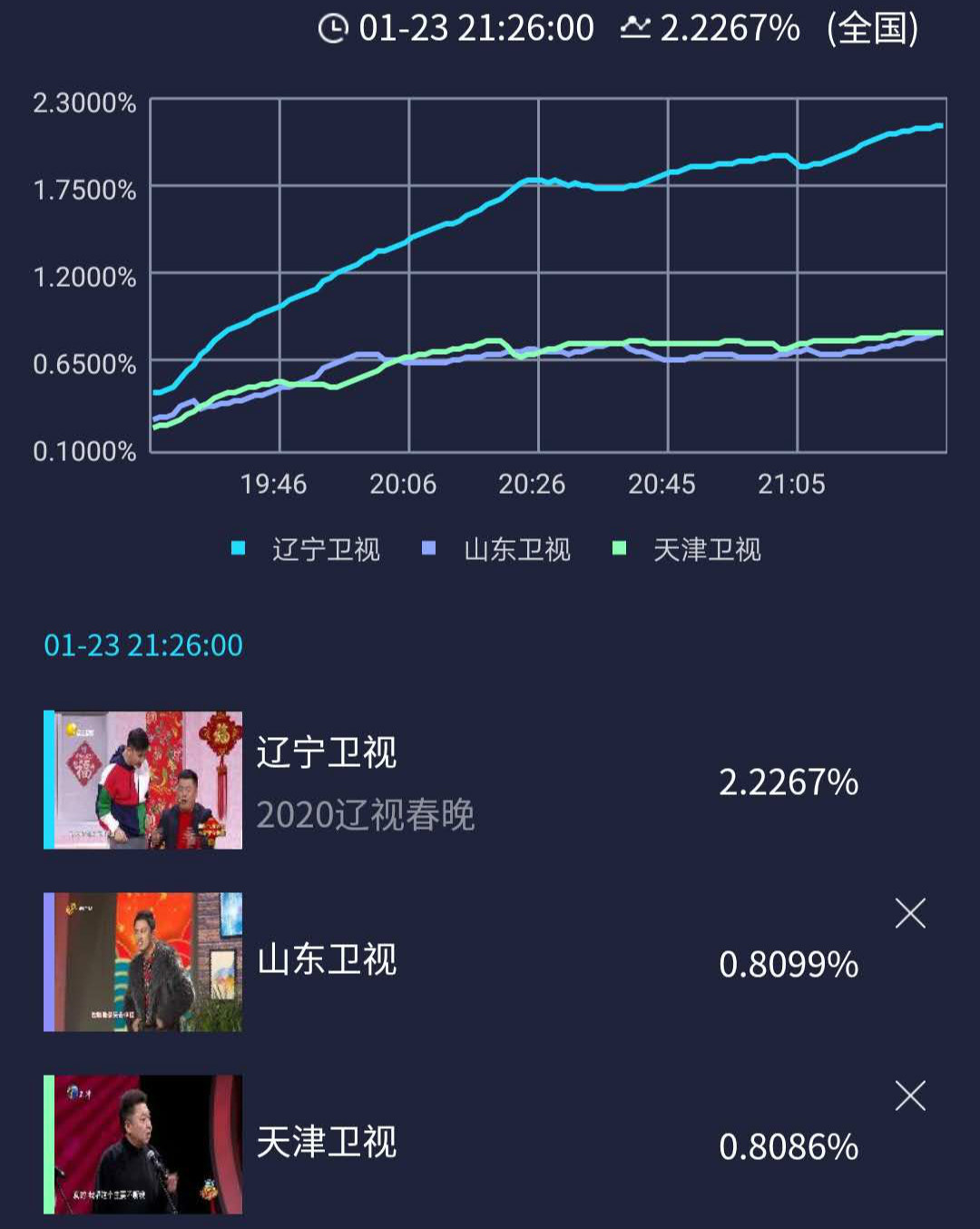 1月23日晚间,辽宁卫视、山东卫视、江西卫视和天津卫视同时播出各自卫视的春晚节目。而根据酷云实时公布的收视率数据来看,辽宁卫视在收视率上,实现了对其它三大兄弟卫视平台的吊打。辽宁卫视的实时最高收视率,更是逼平了2.3%。