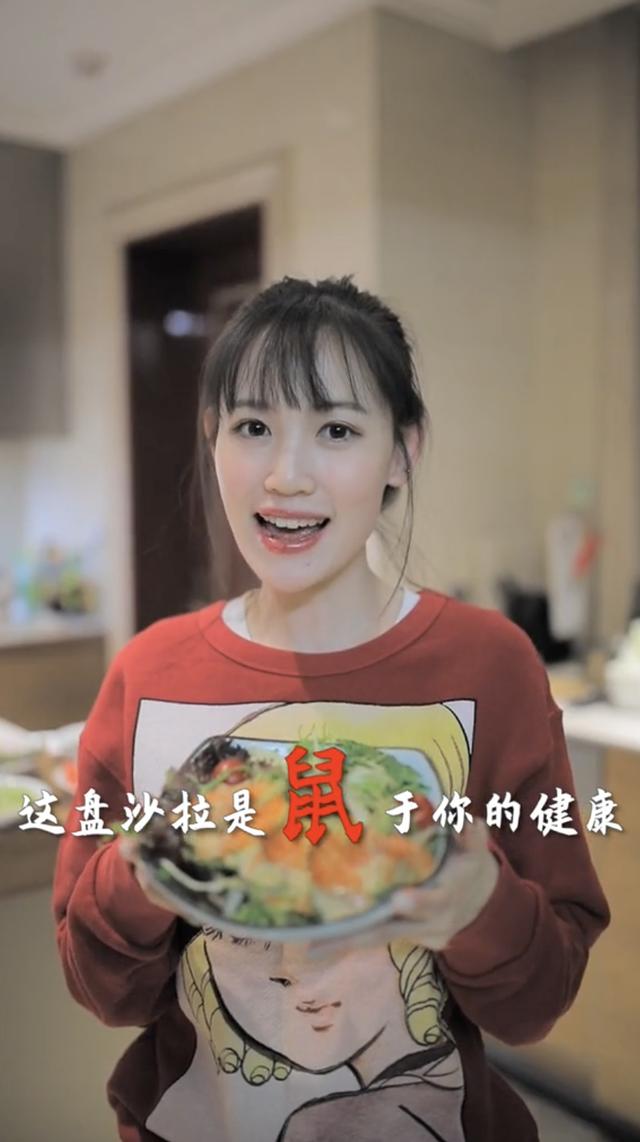 在视频中她拿着一盘水果沙拉, 身穿一身红色贴花卫衣对着镜头说:这盘沙拉是“鼠”于你的健康。