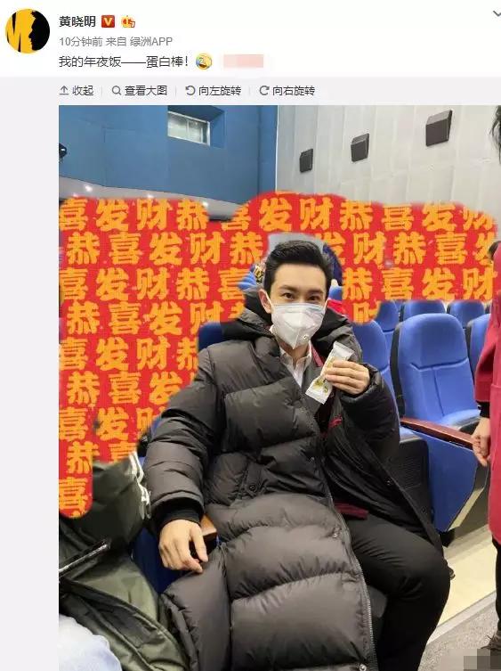 黄晓明则晒出了自己在春晚后台戴着口罩等待时的照片,背景是满满的恭喜发财祝福,感慨表示自己的年夜饭是蛋白棒,网友都称其为了工作太惨了!