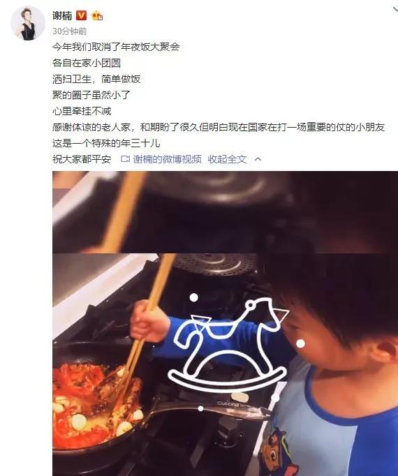 吴京老婆谢楠晒了一则孩子在打扫做饭的视频后称因为今年特殊情况,取消了年夜饭大聚会计划,在家简单做饭,语句中是幸福满满。视频中孩子煮海鲜模样也是十分娴熟,看来经常会被锻炼下厨能力。