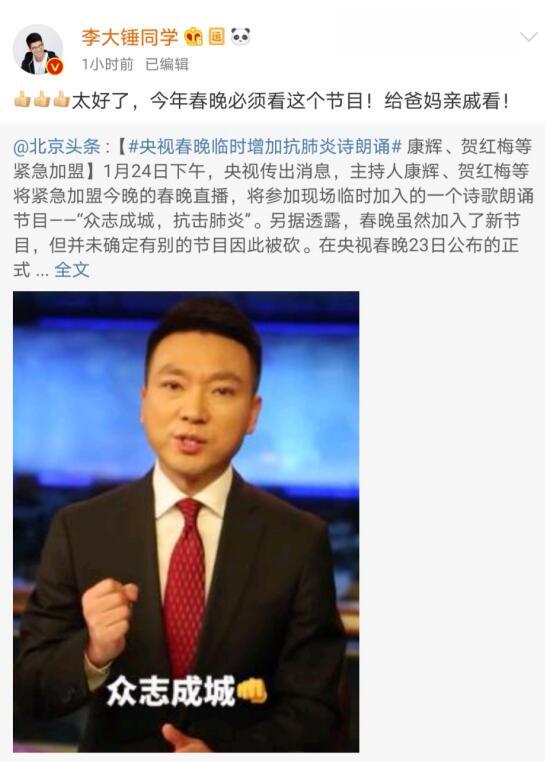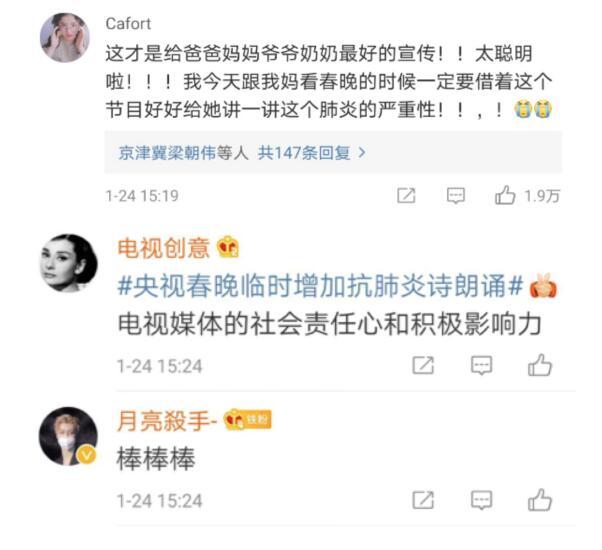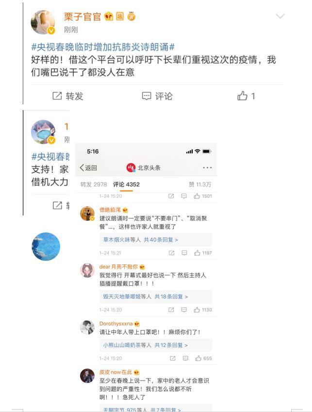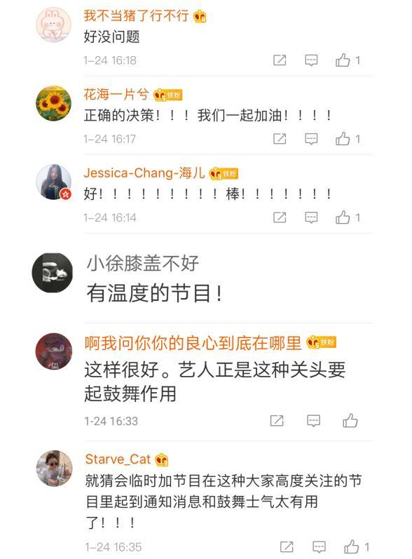 不少网友还认为,春晚临时调整,是非常及时的抗击疫情公开课。网友“希望这一波防护宣传,能对长辈起作用”。