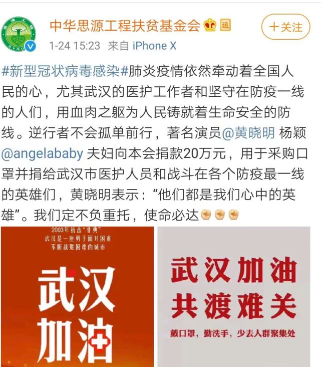 1月24日,“中华思源工程扶贫基金会”发布了微博,透露黄晓明与baby捐款20万元,用于采购口罩,帮助守候我们的英雄。