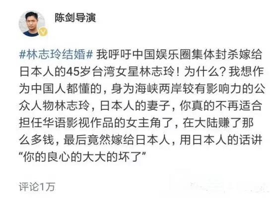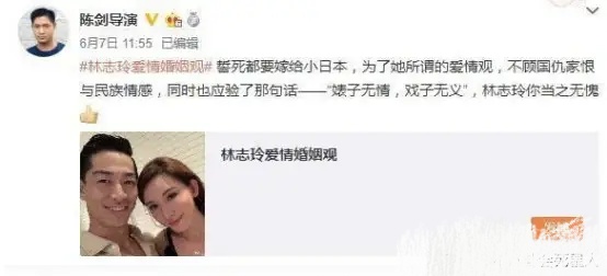 对于林志玲结婚一事除了引起广大的网友们不满,更有导演陈剑当时的激烈反应,连发数条短文呼吁封杀林志玲,痛骂林志玲扭曲的爱情观,并说:“用日本人的话说讲你的良心大大的坏”。
