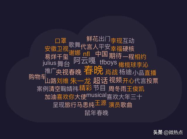 根据春晚播出时段的关键词云,除了涉及到“春晚”“大年三十”“节目”等关键词外,“TFBOYS”“肖战”“朱一龙”“阿云嘎”等多位明星受到网友和粉丝的关注,此外多家应用平台在春晚播出时段进行抽奖、红包“互动”也引得大量观众积极参与。