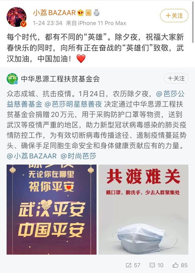 作为一家想为疫情尽一份力的时尚媒体,昨晚除夕夜,芭莎公益慈善基金&芭莎明星慈善夜,也通过中华思源工程扶贫基金会捐赠20万元,用于采购防护口罩等物资,送到武汉等疫情严重的地区