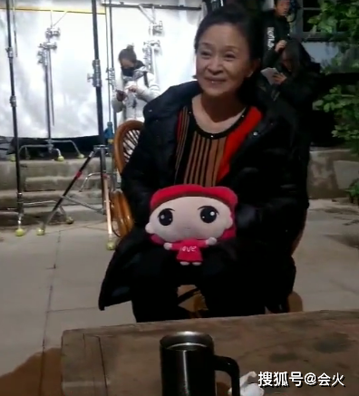刘莉莉穿着条纹衫和黑色棉袄,端坐在椅子上,怀里还抱着暖手宝,一脸慈爱地看着片场大小演员互动,眼神里满满都是爱。