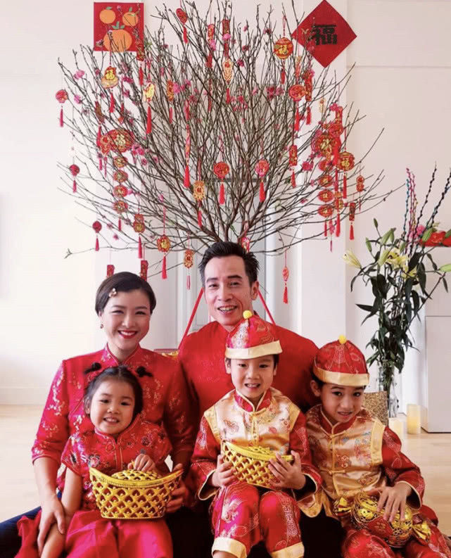 TVB一哥陈豪与太太陈茵媺抱着三个孩子给大家拜年,一家人穿上春节中式服装,很有心思。