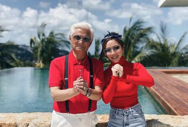 歌手邓紫棋发布与外公的合影,两人都穿着红衣欢度春节。